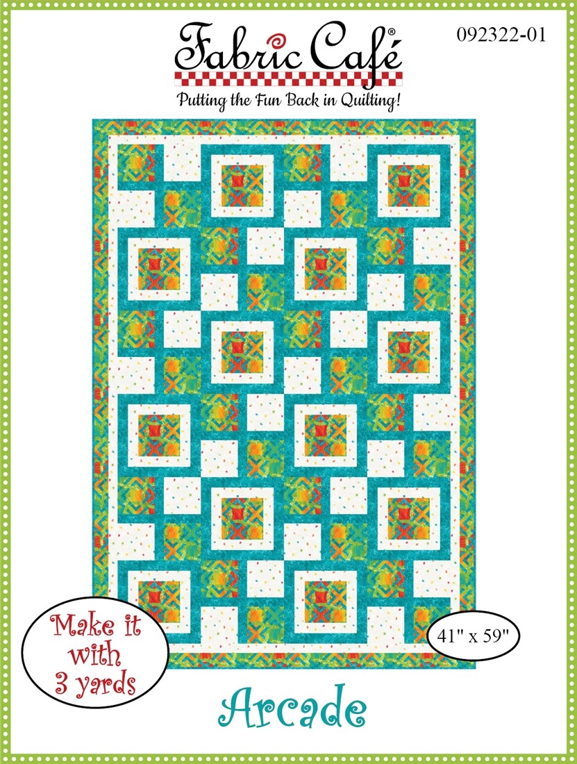 With this Arcade pattern, you simply take 3, one-yard cuts of fabric plus a few hours and make a beautiful quilt top with binding and borders. The pattern includes an assembly diagram and step-by-step directions that make your cutting and piecing a breeze!