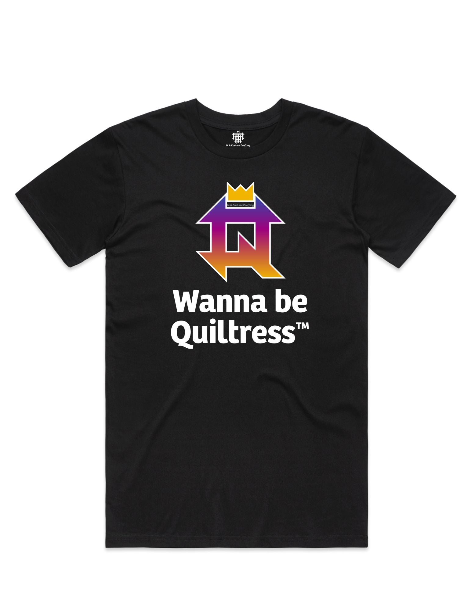 Inject a playful twist into your wardrobe with M A Couture Crafting's unisex short-sleeve ribbed crew neck t-shirt. Showcasing the delightful transformation of a churn dash quilt block into the letter 'Q,' crowned with whimsy, and proudly featuring the spirited title "Wanna Be Quiltress" in our signature ombre colorway. Crafted from 100% ring-spun combed cotton, this shirt effortlessly marries superior comfort with a touch of creative charm. Choose your hue from three timeless colors: Black, White, Grey, or opt for the classic contrast with a black shirt boasting striking white lettering. Embrace the playful creativity with this perfect fusion of comfort and couture for the Quiltress in training within you.